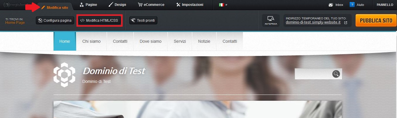 modifica codice HTML. Scorrendo il codice HTML, all’interno dei tag HEAD, troverai la