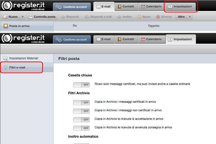 | Modifica Filtri casella chiusa e inoltro automatico |
