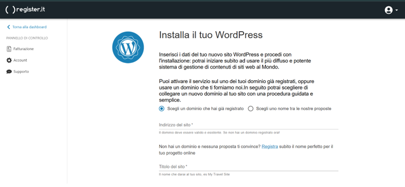 Se selezioni la seconda opzione, il sistema ti proporrà un dominio di terzo livello generato automaticamente: perfetto per provare il prodotto senza dover acquistare nulla.