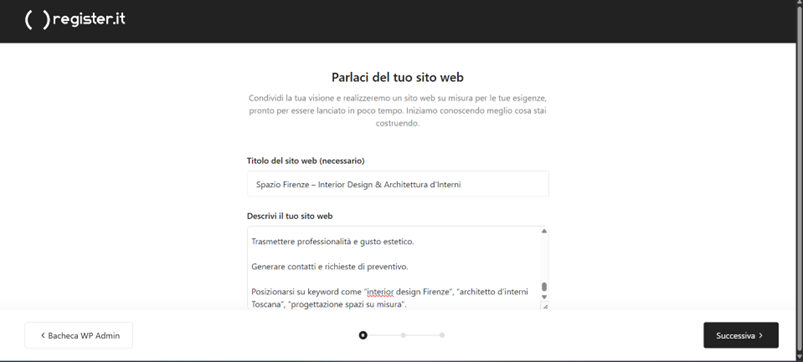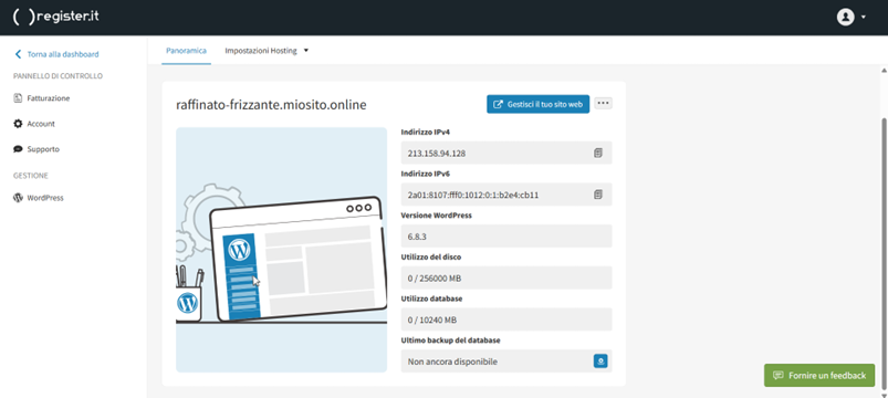 Quando il pulsante “Gestisci il tuo sito web” risulterà attivo, potrai accedere all’onboarding guidato con l’AI.