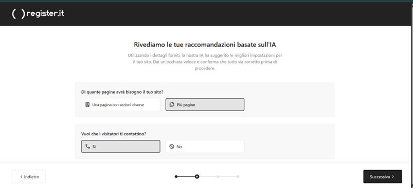 Scegli le pagine che vuoi includere nel tuo sito (es. Home, Contatti, Servizi, ecc.) e continua.