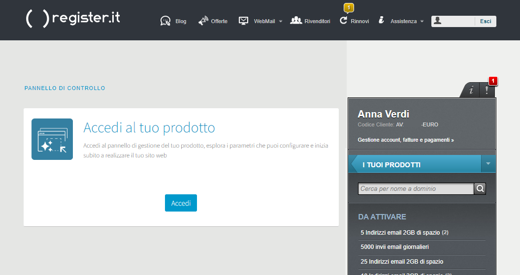 Una volta effettuato l'accesso troverai il tuo prodotto da attivare nel menù a destra.