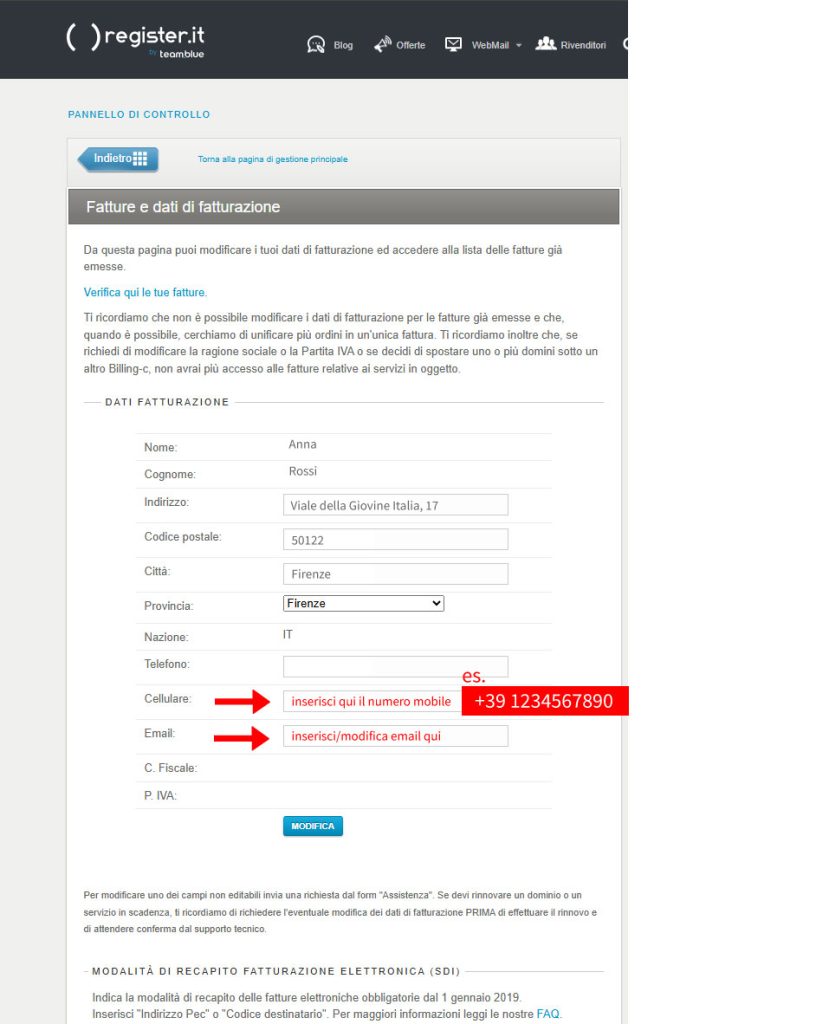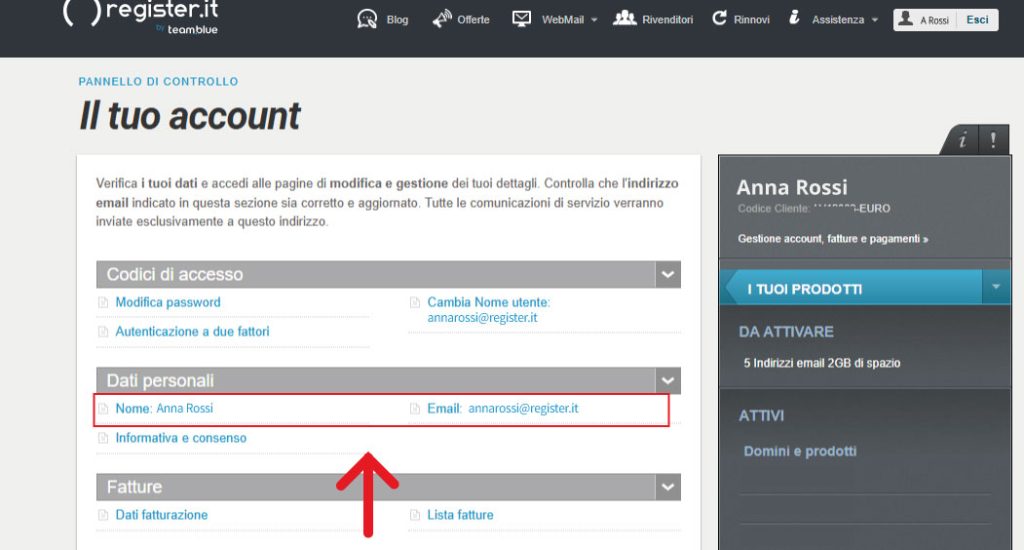 Per modificare i tuoi dati personali, il tuo indirizzo email e numero di telefono associati al tuo pannello di controllo, segui le istruzioni.