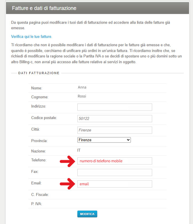 A questo punto, verifica e aggiorna i campi non corretti.