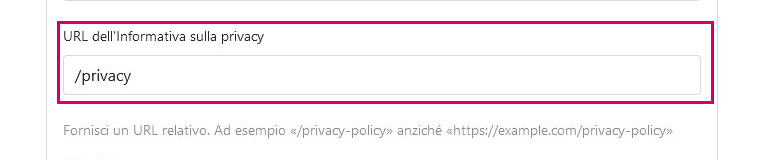 Più in basso c'è la url della nostra pagina della privacy, che di default esiste già sul sito, ma potrete crearne una ad hoc per la cookie policy.