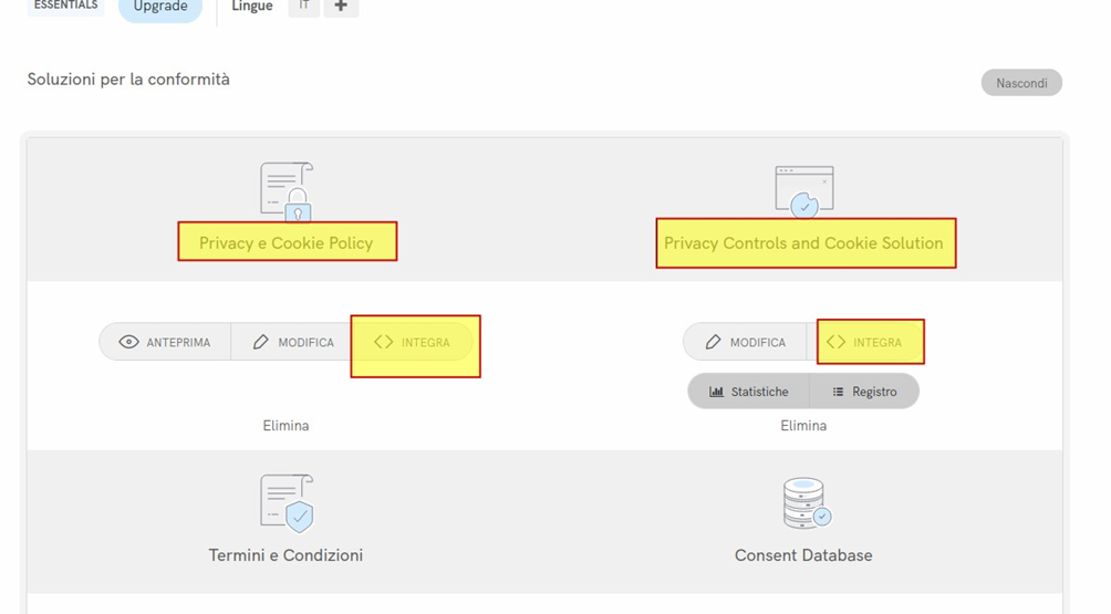 Accedi al tuo account Iubenda e vai nella sezione “Integra”