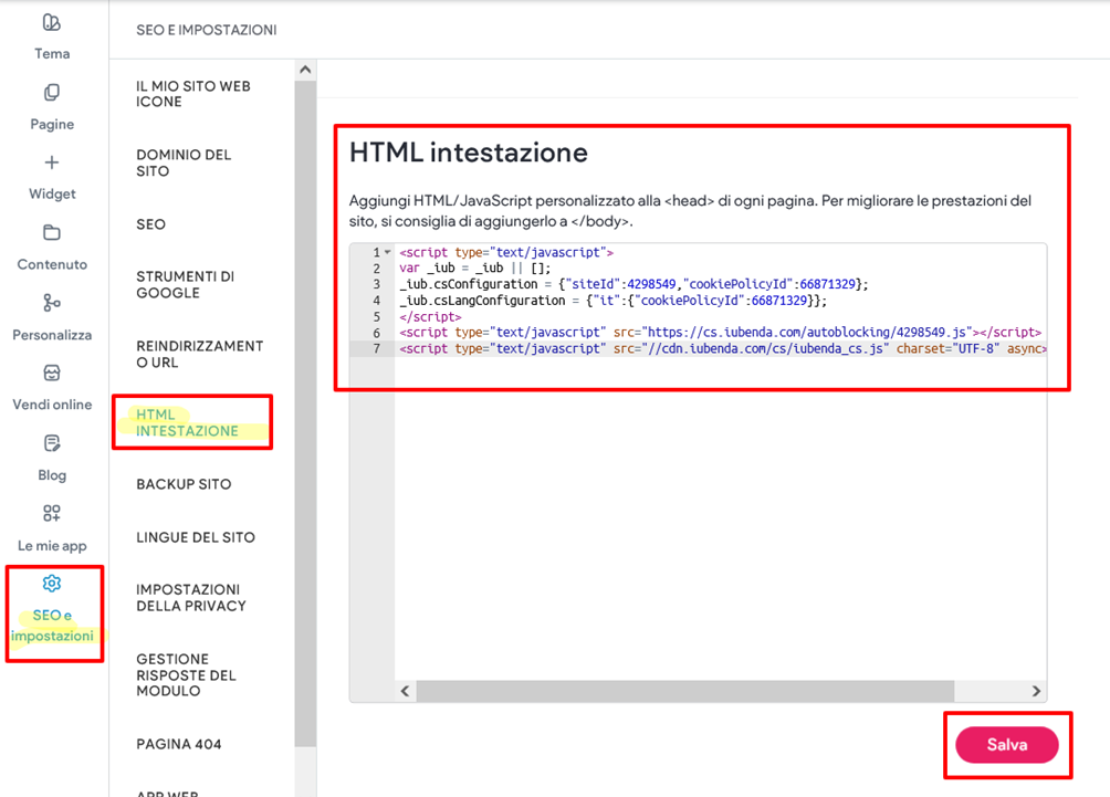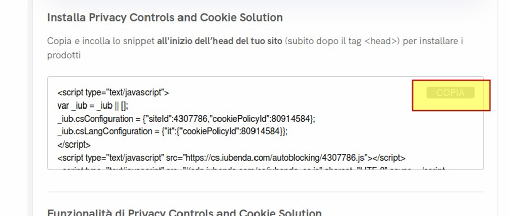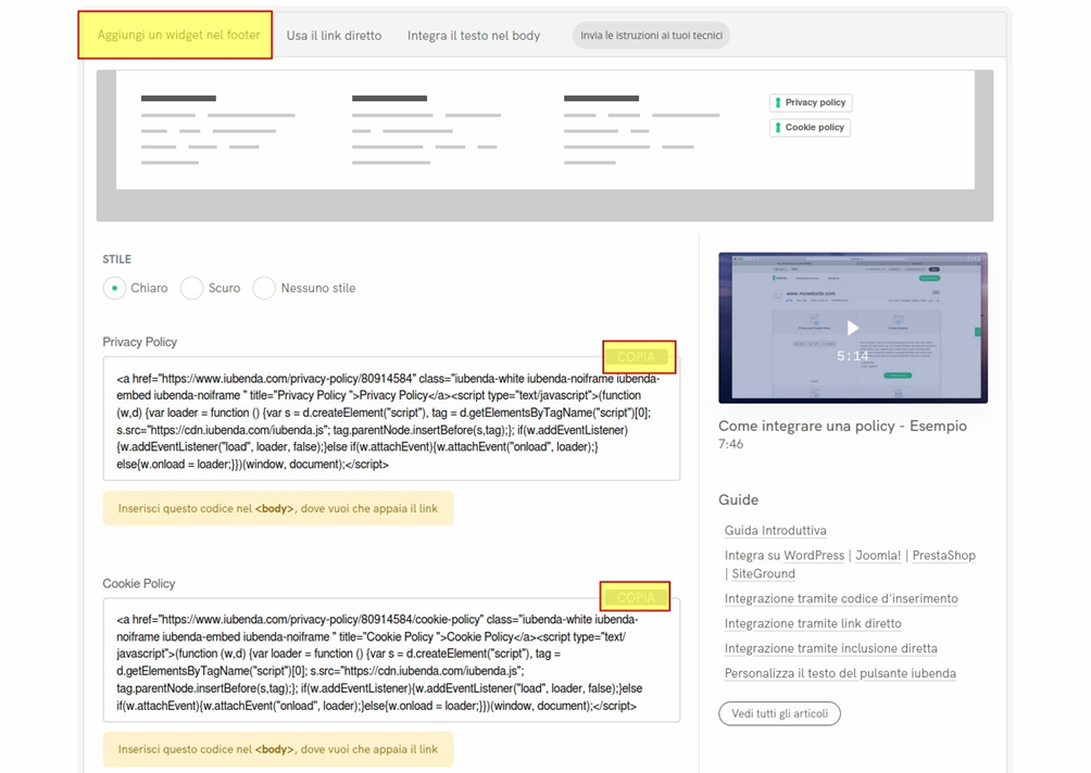 Per entrambe le soluzioni, recupera i codici da Iubenda con questa procedura e prosegui poi a seconda del tipo di sito che hai sviluppato:
