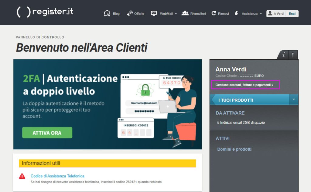 Si verrà reindirizzati automaticamente nel Pannello di controllo del cliente, da cui sarà possibile gestire prodotti, domini e impostazioni tecniche.