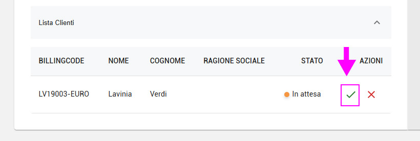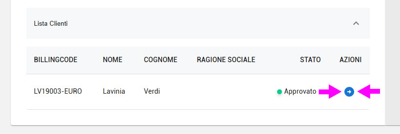 Per entrare nel pannello di un determinato cliente, basta cliccare sull’icona blu con la freccia nella colonna Azioni.