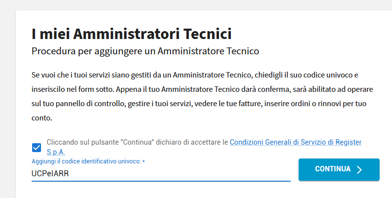 Per essere designato come amministratore tecnico, l’utente deve avere un proprio account attivo su Register.it, con codice cliente valido e dati anagrafici verificati.